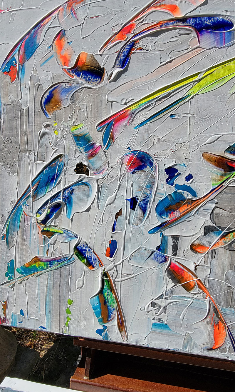 Sur un fond lumineux et texturé, les gestes du couteau créent des arcs dynamiques où les bleus profonds, les rouges vibrants et les touches lumineuses de jaune et de vert dialoguent dans un équilibre spontané.