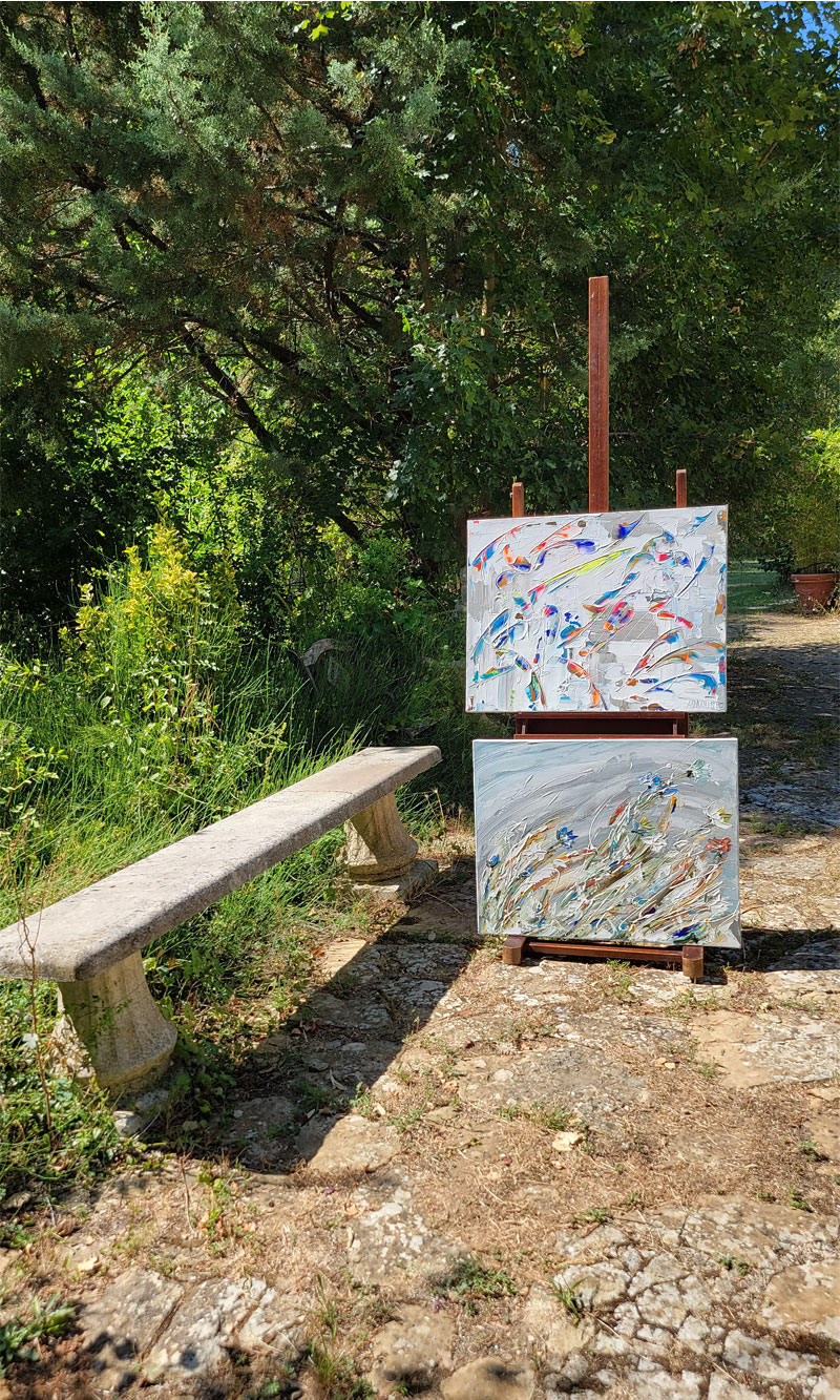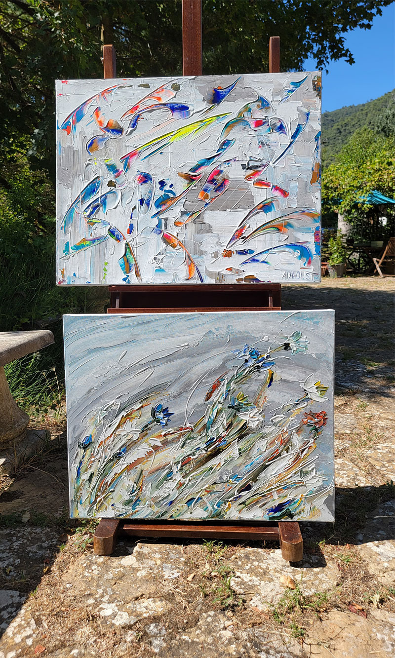 Chaque tableau est une œuvre unique réalisée dans son atelier, où le geste spontané et la lumière participent à la naissance d’une composition vibrante et contemporaine.