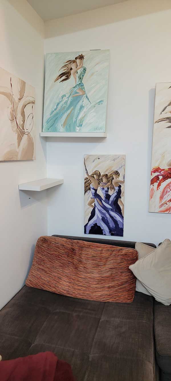 Ici, trois danseuses se répondent dans une harmonie parfaite. Leurs robes aux tons améthyste tourbillonnent, puissantes et fluides à la fois. Les coups de couteau sculptent la lumière dans les violets profonds, tandis que le pinceau adoucit les courbes et donne cette sensation de souffle continu.